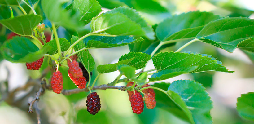 Mulberries have simple, alternate leaves and bear fruit that is beneficial to humans. Where present, it commonly grows in large numbers, frequently in shrub form. The family Moraceae consists of 40 genera and approximately 1000 species. This plant is the topic of the children's nursery song "here we go 'round the mulberry bush".